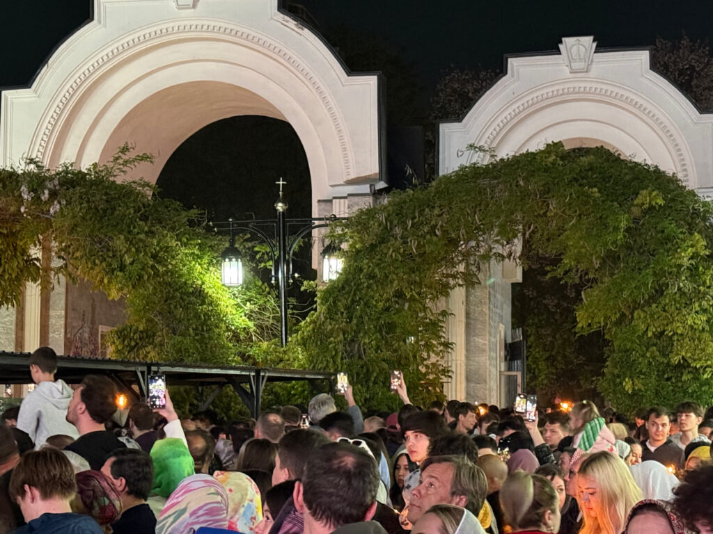 Многие держали в руках зажженные свечи, а часть прихожан следила за происходящим через экраны мобильных телефонов и снимала на видео.