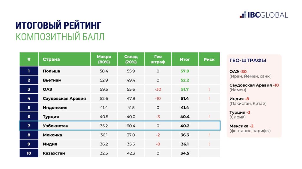 По складской компоненте (вакансия, ставки, обеспеченность площадями) Узбекистан набрал 60,4 балла, это первое место в десятке, выше Польши (55,9) и ОАЭ (55,6). Геополитических штрафов ноль: ни конфликтов, ни санкций (ОАЭ получили минус 30, Саудовская Аравия минус 10, Индия минус 8). Макроэкономика пока скромнее лидеров (35,2 балла), отсюда итоговая седьмая строчка. Но для девелопера главный вопрос, есть ли дефицит и растут ли ставки, и здесь Узбекистан номер один.