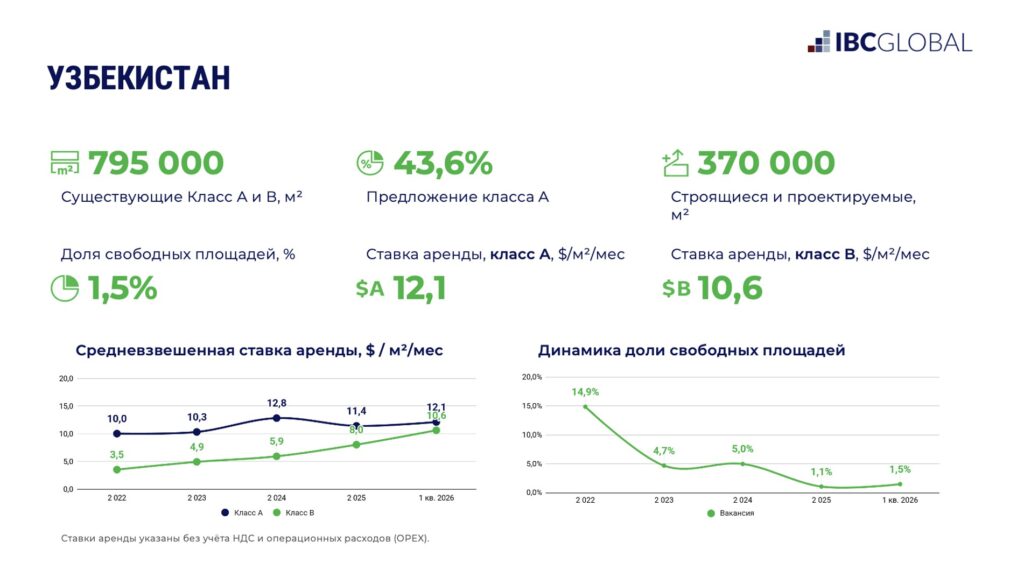 Складской рынок Узбекистана на данный момент является одним из самых дефицитных в мире. По данным, представленным IBC Global, совокупный объем предложения качественных складов классов А и В в стране составляет 795 тыс. кв. м. В регионе фиксируются растущие ставки аренды (порядка $12/кв. м/мес., а в классе В — $10,6/кв. м/мес. без ОРЕХ и НДС, что выше ставок в Нью-Йорке), острый дефицит качественного предложения (сейчас нехватка качественной складской инфраструктуры составляет почти 400 тыс. кв. м). Доля класса А достигла 43,6% и продолжает расти. Вакансия в сегменте А на уровне математической погрешности 1,5%, что является классическим «рынком арендодателя» с вымыванием предложения площадей на стадии проектирования.