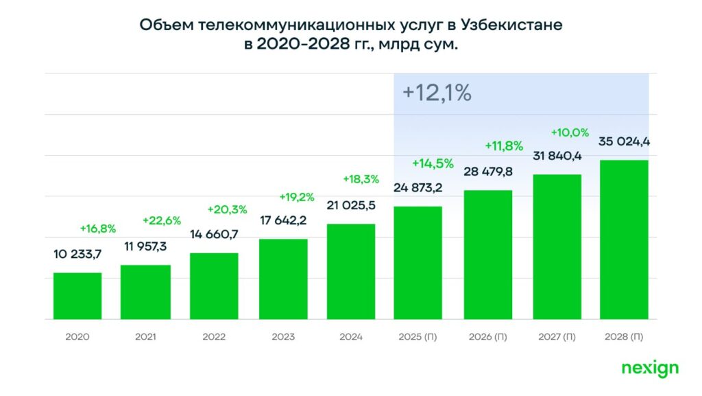 По итогам 2025 года телеком-рынок Узбекистана достиг 24,9 трлн сумов, при годовом росте на 18,3%, следует из отчета компании Nexign и аналитического агентства TelecomDaily. Темпы роста оказались выше региональных.