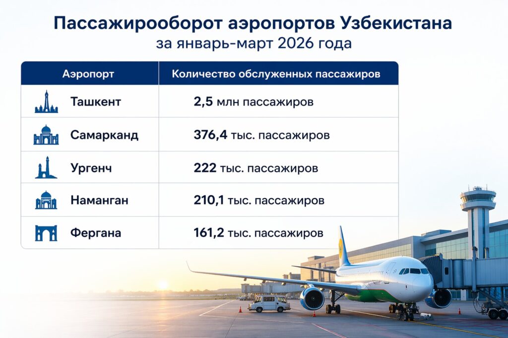 Аэропорты Узбекистана за январь – март 2026 года обслужили 30,8 тыс. авиарейсов, что на 10% больше, чем годом ранее, следует из статистики компании Uzbekistan Airports.