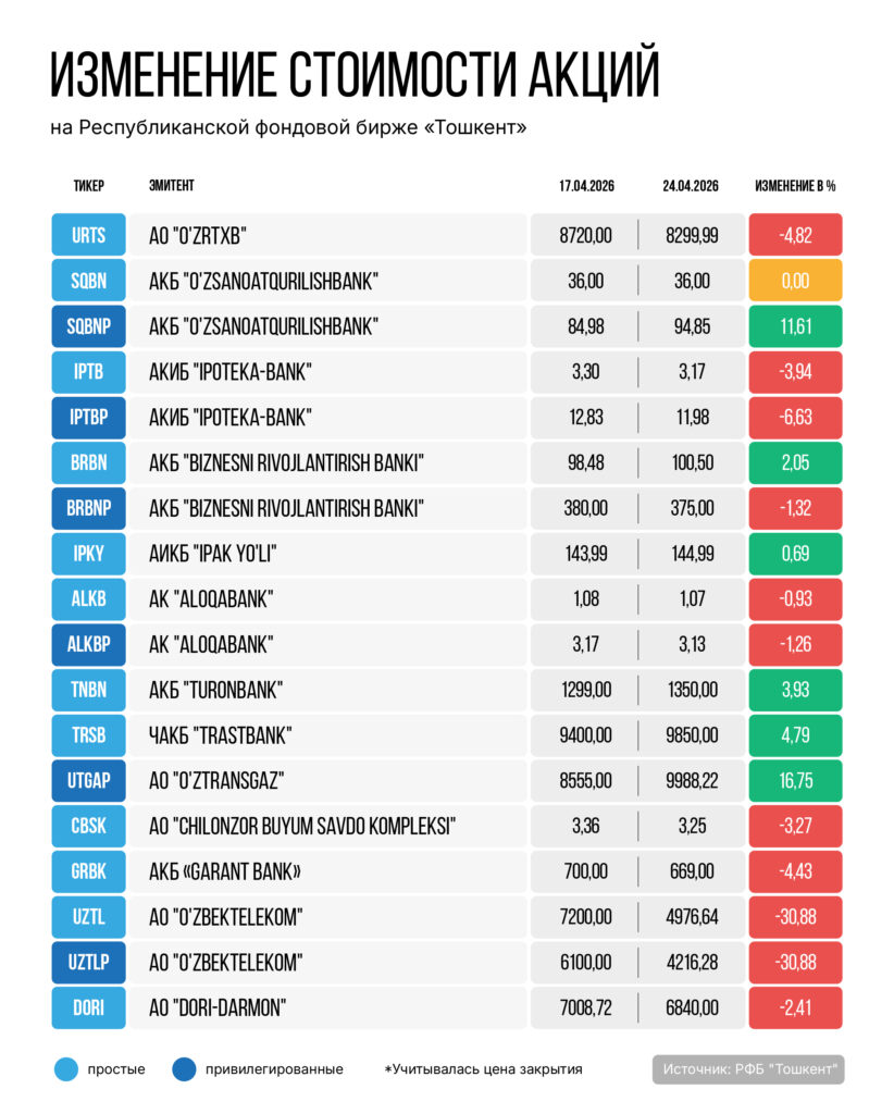 Акции «Узбектелекома» (как простые, так и привилегированные), наоборот, скорректировались на 30,88%. Ранее торги ими приостанавливали из-за выпуска дополнительных бумаг, но 21 апреля они возобновились. Поэтому РФБ скорректировала цену для простых акции до 2 400 сумов, а привилегированных — до 2 033 сумов.