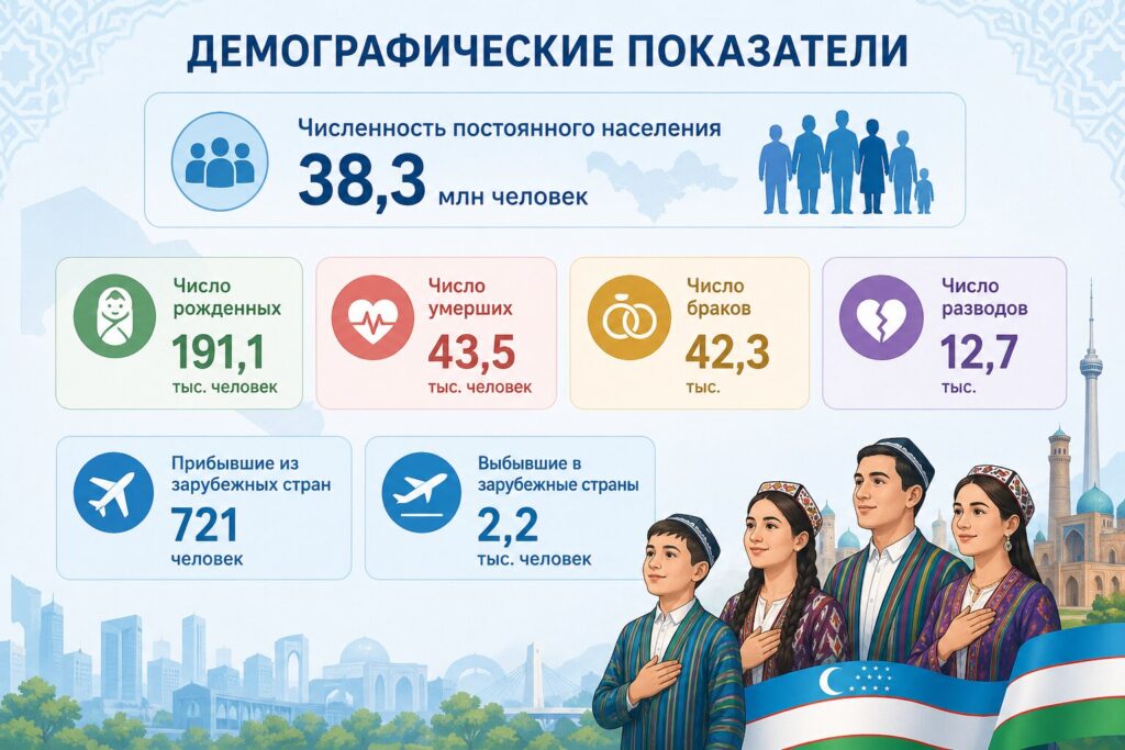На начало апреля 2026 года численность населения Узбекистана превысила отметку в 38,3 млн человек при годовом приросте на 1,8%. Отчет об этом опубликовал Нацкомстат.