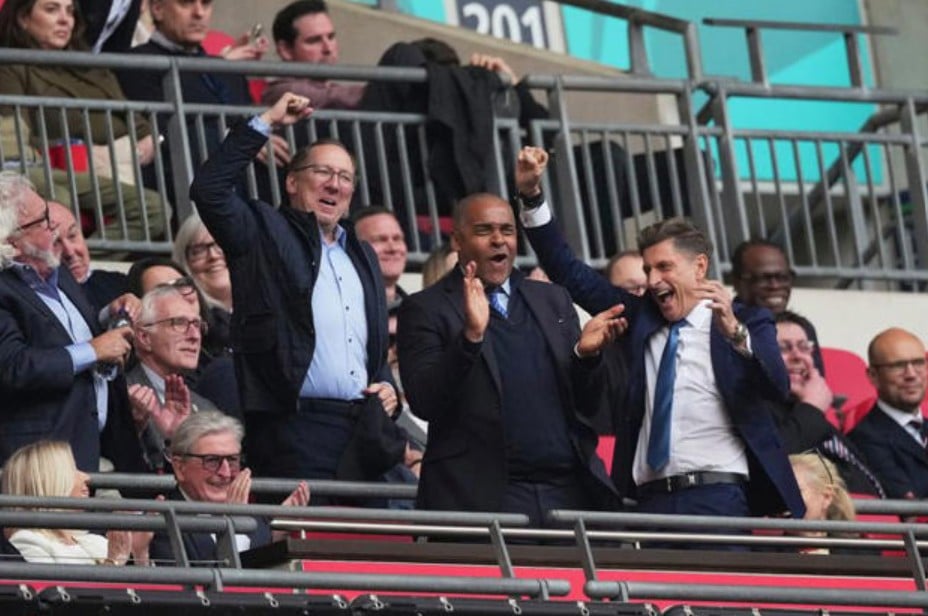 Crystal Palace directors John Textor, left, Mark Bright, centre and Steve Parish celebrate. Photo: AP