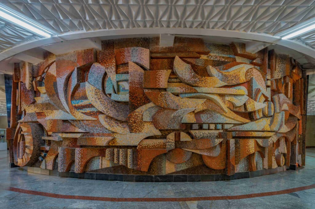 One notable artist was Gan Arnold Pavlovich, whose works are known to everyone who has ever lived and been to Tashkent. Most notable of his works in the “Kosmonavtlar” station on the Tashkent metro line. It is one of the most memorable stations in the Uzbek subway system. However, not all of his mosaic panels are preserved. Here are two of them, that still stand tall on the capital.
