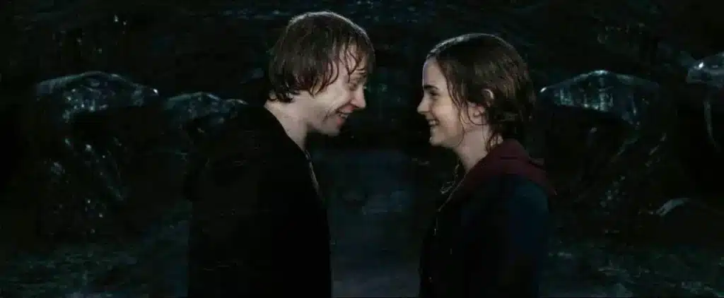 Ron and Hermione’s long-awaited first kiss happens during the Battle of Hogwarts in both versions, but the context is vastly different. In the film, it is a surge of adrenaline after they destroy a Horcrux in the Chamber of Secrets. In the book, it is far more meaningful. As they prepare to fight, Ron suddenly worries about the house-elves in the kitchens, saying,