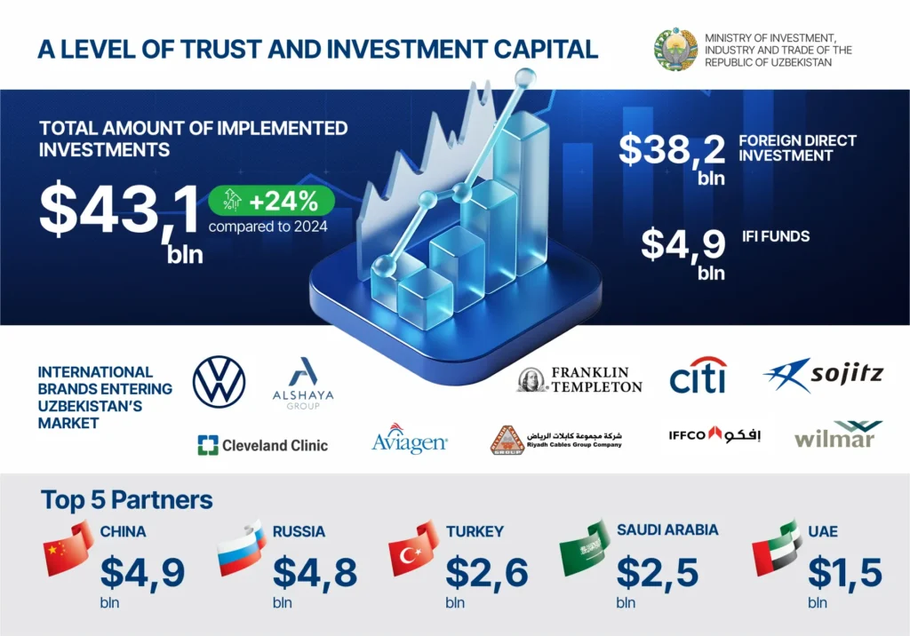 Uzbekistan’s total investment in 2025 reached $43.1 bn, a 24% increase compared with 2024, the Ministry of Investment, Industry and Trade reports.
