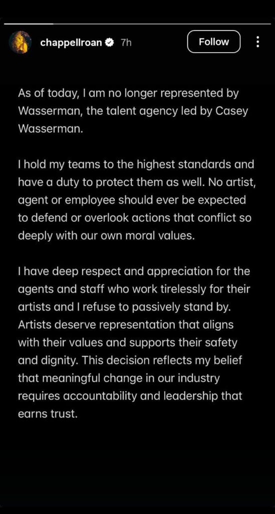 Roan explained on Instagram that her departure reflects her belief that artists «deserve representation that aligns with their values and supports their safety and dignity,» adding that accountability and leadership are needed to restore trust in the industry.