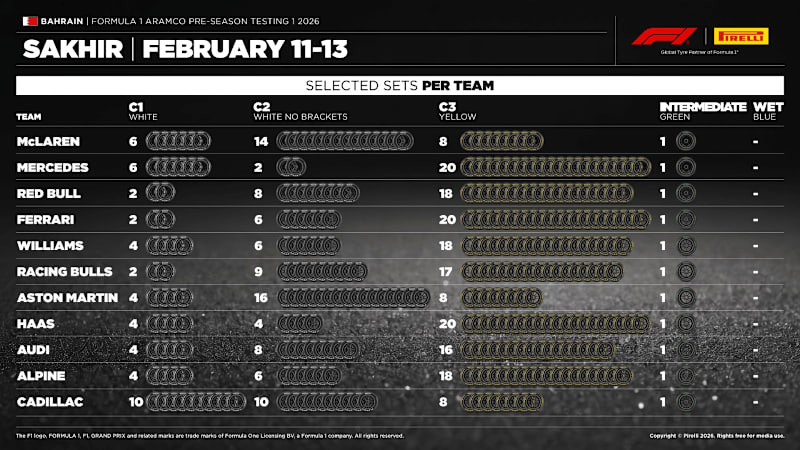 Pirelli has supplied the C1, C2 and C3 compounds for the week, with teams selecting varying allocations. Tyres are slightly narrower this season and drivers have reported reduced downforce and traction compared to the previous generation.
