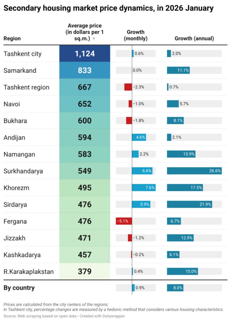 Growth in the capital’s primary real estate was stronger. Over the past year, prices for newly built homes climbed by more than 9%, with the most notable increases in Mirabad and Mirzo-Ulugbek districts.