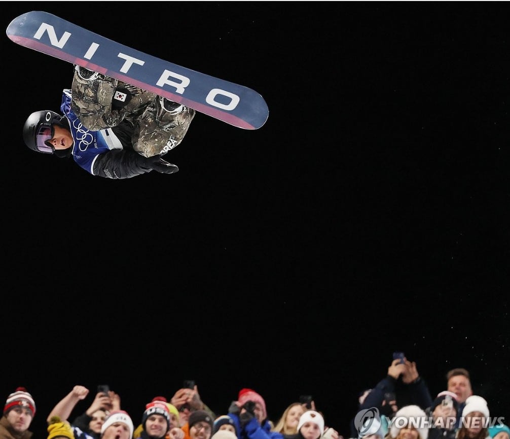 Lee Chaeun of South Korea performs during the final of the men’s halfpipe snowboarding event at the Winter Olympics at Livigno Snow Park in Livigno, Italy, on Feb. 13, 2026. Photo: Yonhap