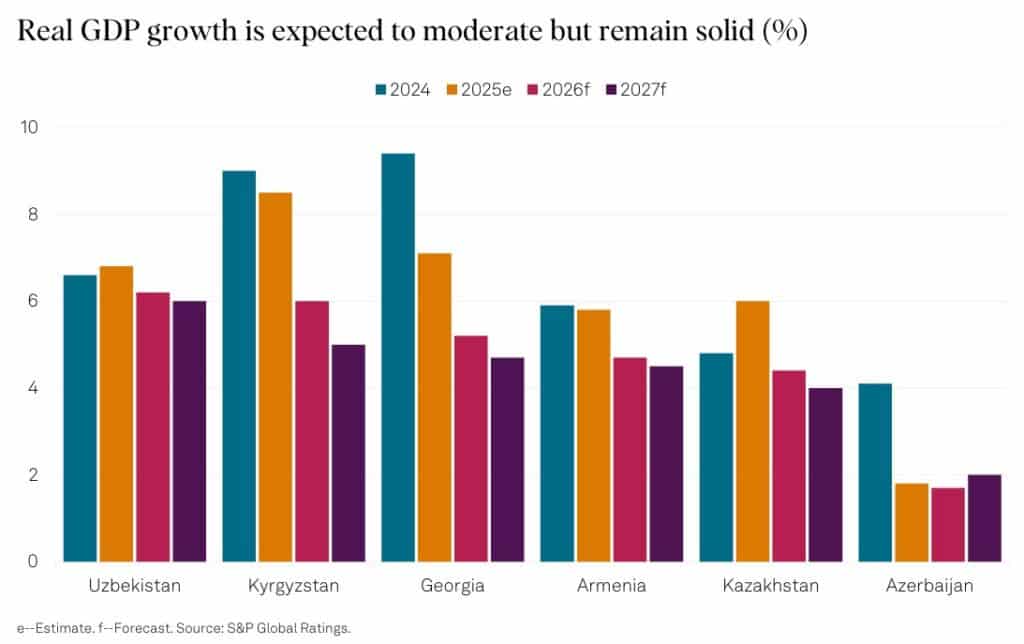 Economic growth across the region is expected to remain solid but gradually moderate compared with recent years, with Uzbekistan benefiting from strong investment and consumption, while Kazakhstan’s growth will be supported by oil output.