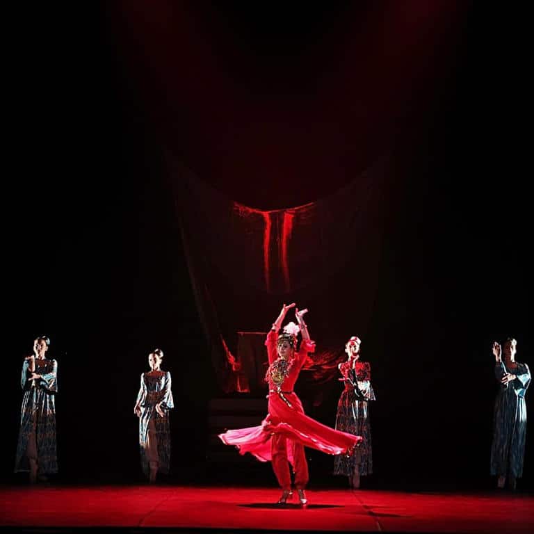 The performance blends traditional Lazgi choreography with classical ballet structure. Developed with international creative partners, the production transforms ritual movement into a large-scale theatrical narrative, featuring an original score and contemporary stage design.