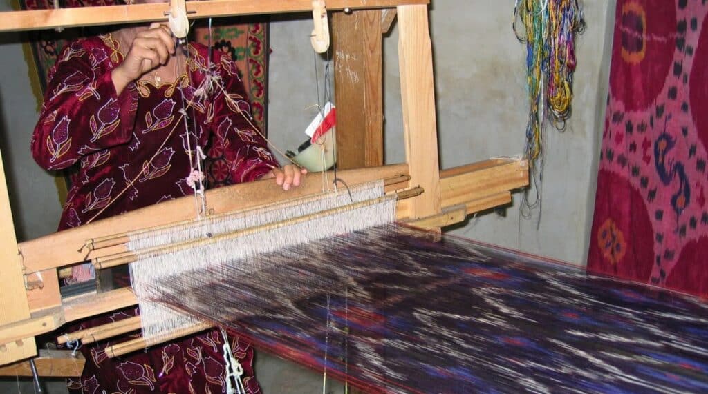 Silk production, particularly in the Fergana Valley, has long been central to Uzbekistan’s heritage. Historically, silk from the region was highly prized and widely traded along the Silk Road. Women have traditionally played a key role in the process, from raising silkworms to dyeing threads and weaving fabrics such as ikat and adras.