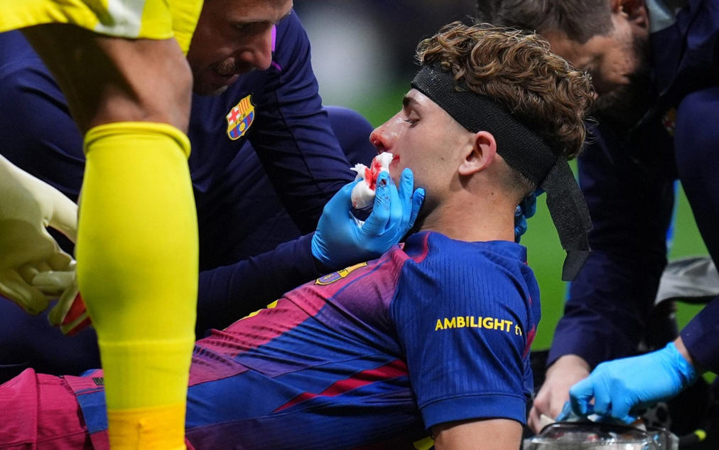 Fermin Lopez suffered a bloody facial injury after being kicked by Juan Musso during Barcelona’s Champions League quarter-final defeat to Atletico Madrid.