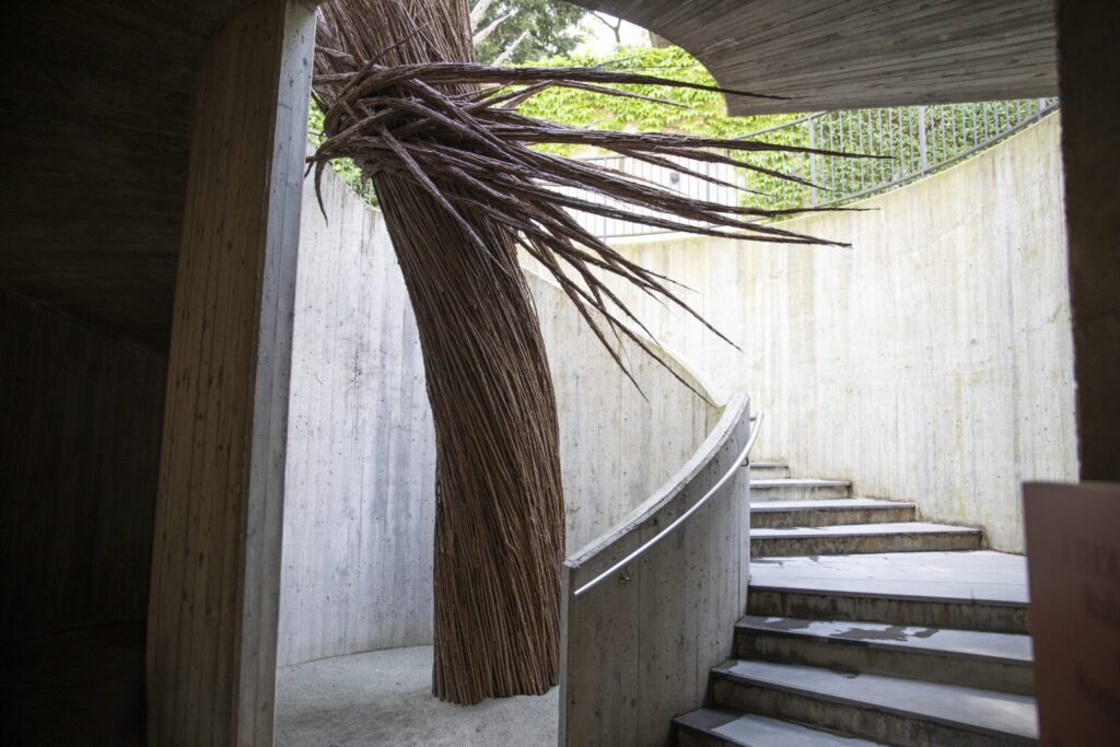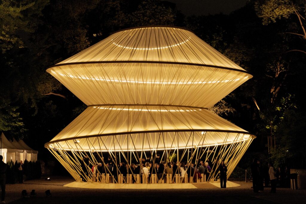 Curator Kulapat Yantrasast has designed a «deconstructed yurt» pavilion in the garden of Palazzo Citterio. Inspired by nomadic architecture, the structure serves as a space for talks, workshops, and dialogue on sustainability and adaptation.