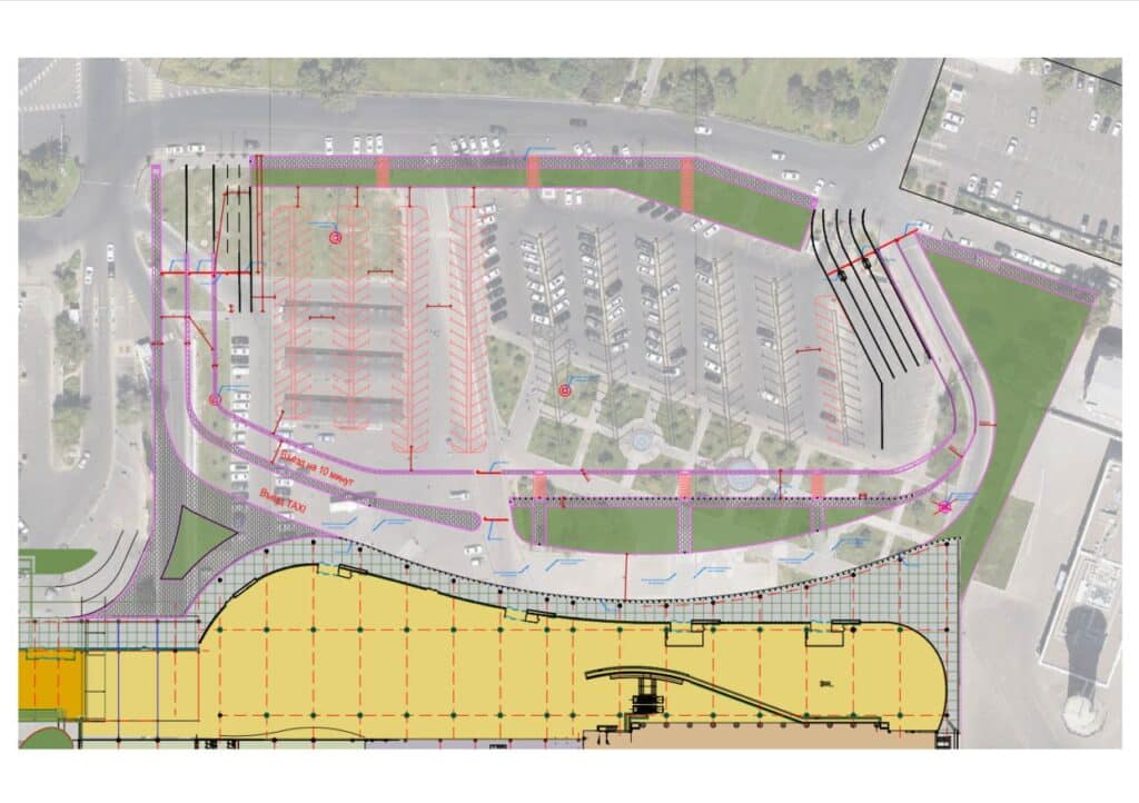 Loyihaga bino fasadini kengaytirish, qo‘shimcha yo‘llar qurish va litsenziyalangan taksi operatorlari orqali turli narx toifalarida xizmat ko‘rsatish kiradi. Birinchi qatordagi yo‘l turistik avtobuslar va aeroportning rasmiy taksilari uchun mo‘ljallangan, ikkinchi qatorda esa kutib oluvchilar va taksi agregatorlari avtomobillari harakatlanadi. Yo‘llarda to‘xtash vaqti 10 daqiqa bilan cheklangan, videokuzatuv kameralar nazorat qiladi.