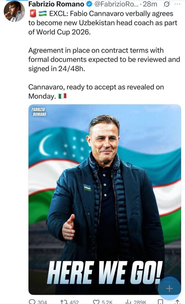 Mashhur futbol jurnalisti Fabritsio Romanoning xabariga ko‘ra, Italiya futbol afsonasi Fabio Kannavaro O‘zbekiston milliy terma jamoasini boshqarishga kelishib oldi.