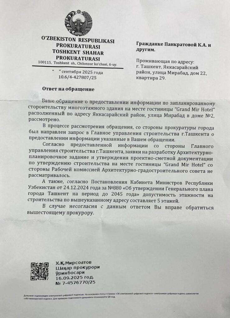 Toshkent shahar prokuraturasi Bog‘saroy mahallasi aholisining Grand Mir Hotel mehmonxonasi atrofidagi vaziyat bo‘yicha murojaatini ko‘rib chiqdi, deb xabar berdi bloger Nikita Makarenko.
