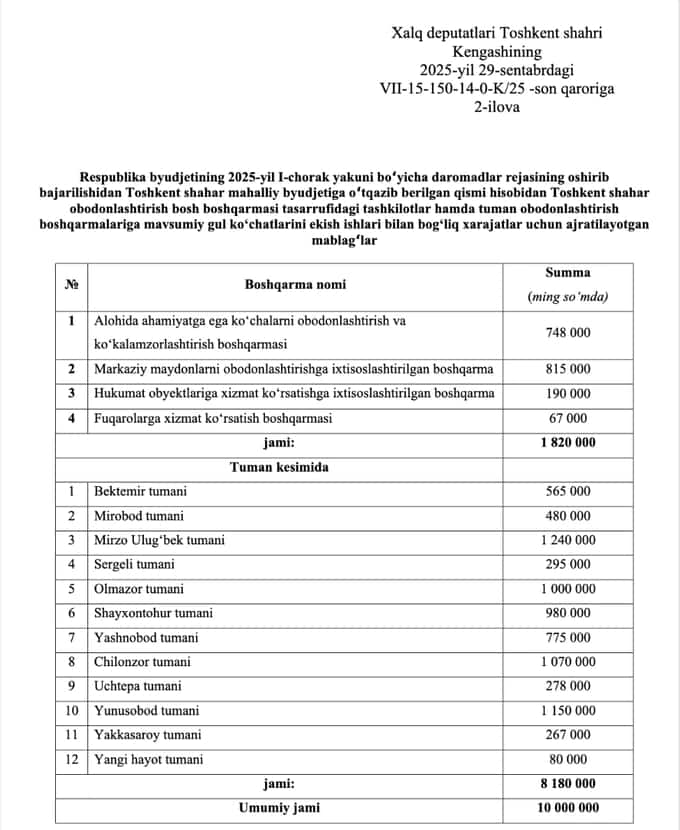 Qarorga ko‘ra, ajratilgan mablag‘ning 1,82 milliard so‘mi turli obodonlashtirish boshqarmalariga, 8,18 milliard so‘mi esa tumanlar kesimida taqsimlanadi.