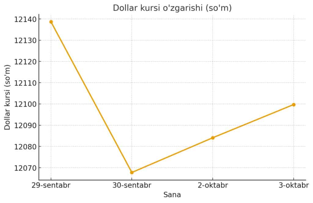 O‘zbekistonda sentabr oxiri va oktabr boshida dollar kursi asosan pasayish tendensiyasida davom etdi. 29-sentabr kuni AQSh valyutasi 61,04 so‘mga arzonlab, 12 138,67 so‘m qilib belgilandi. 30-sentabrda pasayish davom etdi va kurs 12 067,76 so‘mni tashkil qildi. Oktabr boshida esa vaziyat biroz o‘zgardi. 2-oktabrda dollar 16,34 so‘mga oshib, 12 084,10 so‘m bo‘ldi. 3-oktabrda esa yana 15,62 so‘m ko‘tarilib, 12 099,72 so‘mga yetdi. Qisqa muddatli o‘sishlarga qaramay, umumiy hisobda dollar 38,95 so‘mga pasaydi.