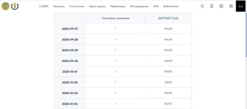 Qozog‘istonda dollar kursi aksincha mustahkamlandi. 27–29 sentabr kunlari 544,26 tenge darajasida barqaror turgan kurs 30-sentabrda 548,79 tengega chiqdi. 1-oktabrda 549,06 tenge, 2-oktabrda esa 549,15 tenge qayd etildi. 3-oktabrda 546,96 tengega biroz pasaydi, biroq 4-oktabrda yana 547,57 tenge bo‘ldi. Umumiy hisobda dollar bir hafta ichida 3,31 tengega qimmatlashdi.