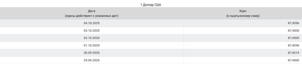 Qirg‘izistonda esa kurs deyarli o‘zgarmadi, lekin umumiy hisobda pasayish qayd etildi. 29-sentabrda dollar 87,45 som bo‘lgan bo‘lsa, 30-sentabrda 87,4019 somga tushdi. 1-oktabrda 87,4096 som qilib belgilandi. 2 va 3-oktabrda yana 87,45 som darajasida qayd etildi. 4-oktabrda esa 87,4396 som bo‘ldi. Demak, hafta davomida kurs 0,0104 somga pasaydi, ya’ni dollarning qadriga deyarli ta’sir qilmagan kichik o‘zgarish kuzatildi.
