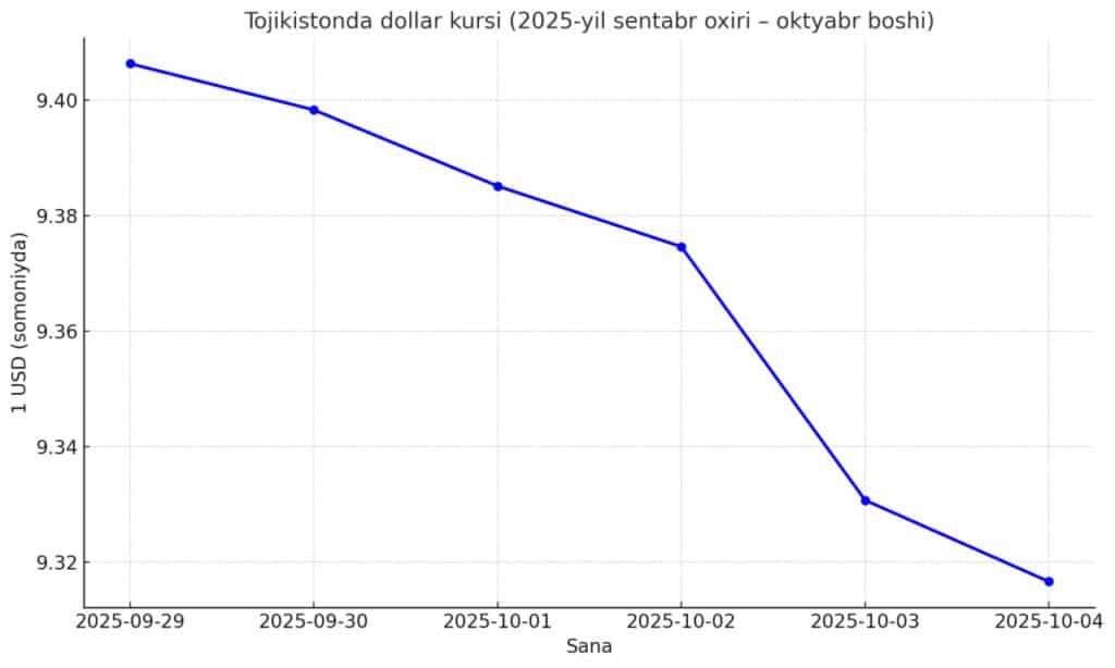 29-sentabrda 1 AQSh dollari 9,4063 somoniy qilib belgilangan bo‘lsa, 30-sentabrda u biroz pasayib 9,3983 somoniyga teng bo‘ldi. 1-oktabrda dollar yana tushib, 9,3851 somoniyni tashkil etdi. 2-oktabrda pasayish davom etdi va kurs 9,3746 somoniy bo‘ldi. 3-oktabrda esa yanada keskinroq tebranish kuzatilib, dollar 9,3307 somoniy darajasiga tushdi. 4-oktabrga kelib esa kurs 9,3166 somoniy qilib belgilandi.