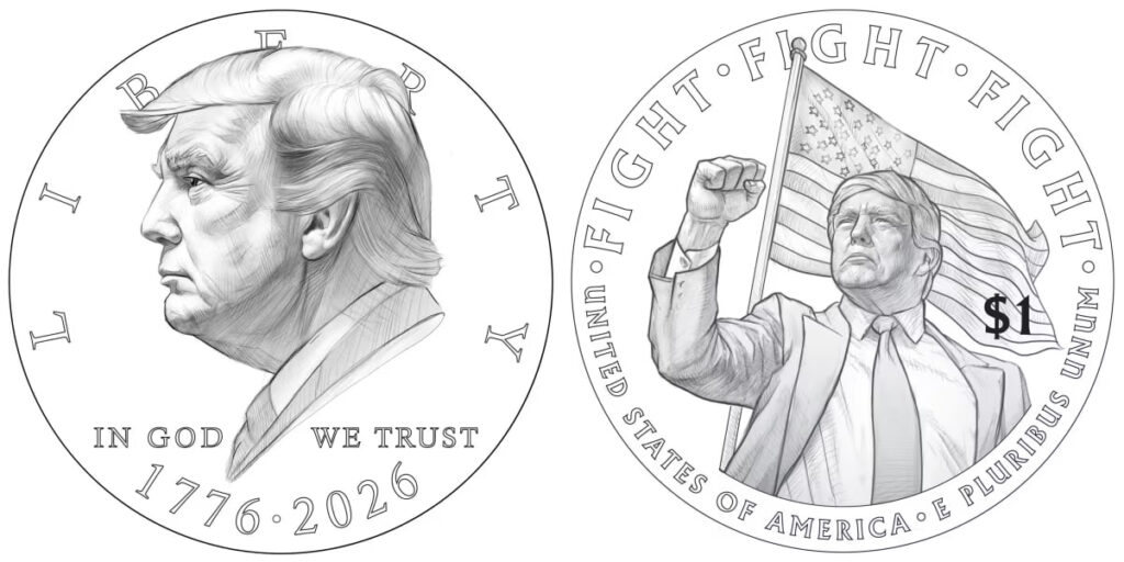 Tanganing old tomonida Trampning yon profili, yuqorisida «Liberty», pastida esa «In God We Trust» yozuvi va «1776–2026» sanalari aks etgan. Orqa tomonida esa Pensilvaniyada sodir bo‘lgan suiqasdga urinishdan so‘ng Trampning musht ko‘targan mashhur tasviri joy olgan.