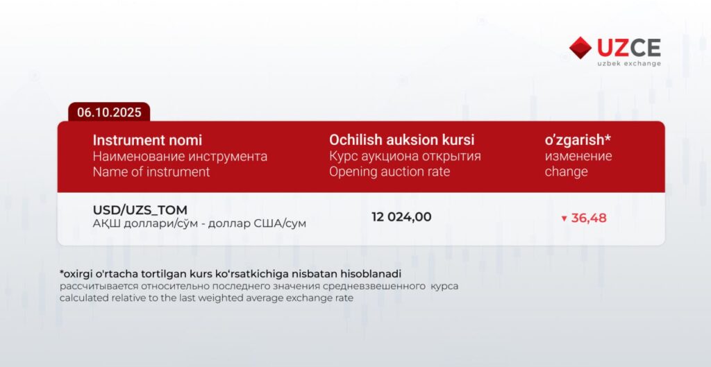 Soat 10:30 da koll-auksion shaklida o‘tkaziladigan ochilish savdolari natijalariga ko‘ra kurslar birjaning rasmiy manbalarida e’lon qilinadi.
