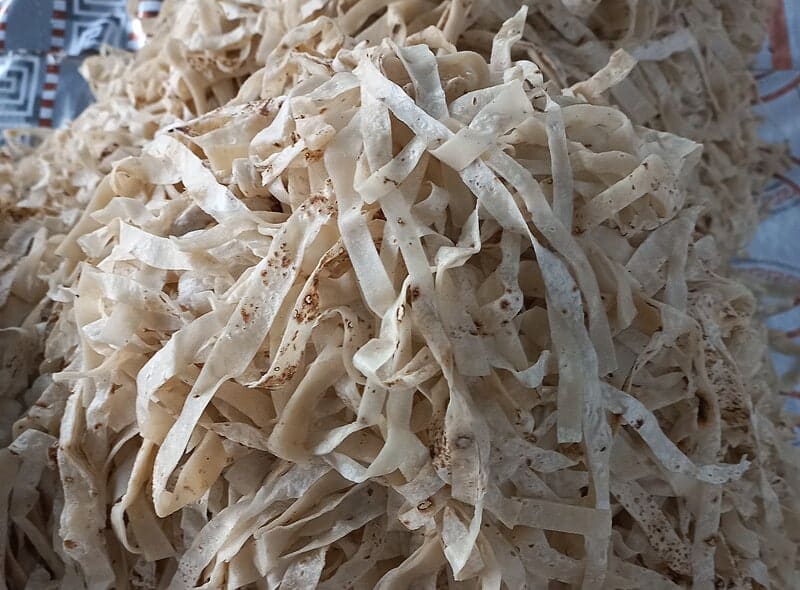 Tingan xamir ikki uchta zuvalaga ajratilib, yupqa, 1,5 – 2 mm qalinlikda yoyiladi. So‘ngra kattaroq tova shaklidagi kengroq qizib turgan qozonga ikki tarafi biroz qizdirib olinadi. Jarayonda u xuddi lavash xamiri kabi qora nuqtalar bilan pishib chiqadi. So‘nga pishib chiqqan xamirlar, uzun-uzun shaklda kesiladi.