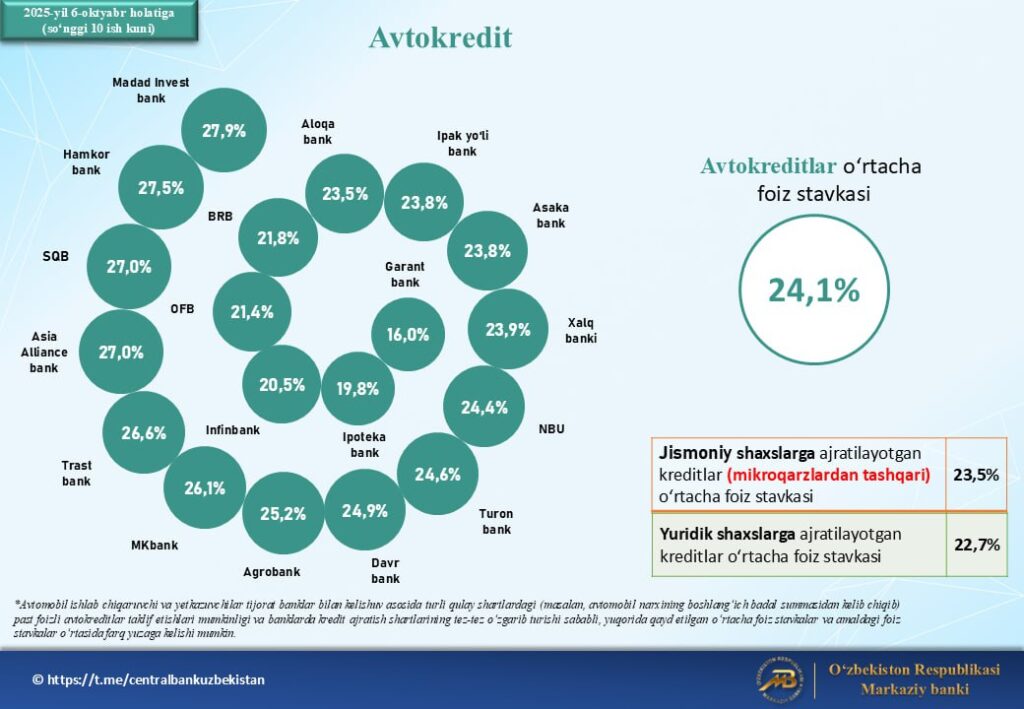 Avtomobil xaridi uchun ajratilayotgan kreditlar bo‘yicha esa o‘rtacha foiz stavkasi 24 foizdan 24,1 foizga ko‘tarildi. Shundan jismoniy shaxslarga ajratilayotgan kreditlarning (mikroqarzlardan tashqari) o‘rtacha foiz stavkasi 23,5 foizni, yuridik shaxslar ulushi esa 22,7 foizni ko‘rsatmoqda.