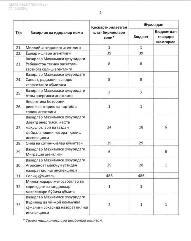 Ijro hokimiyatida ikki mingdan ortiq shtat birliklari qisqartiriladi — jadval
