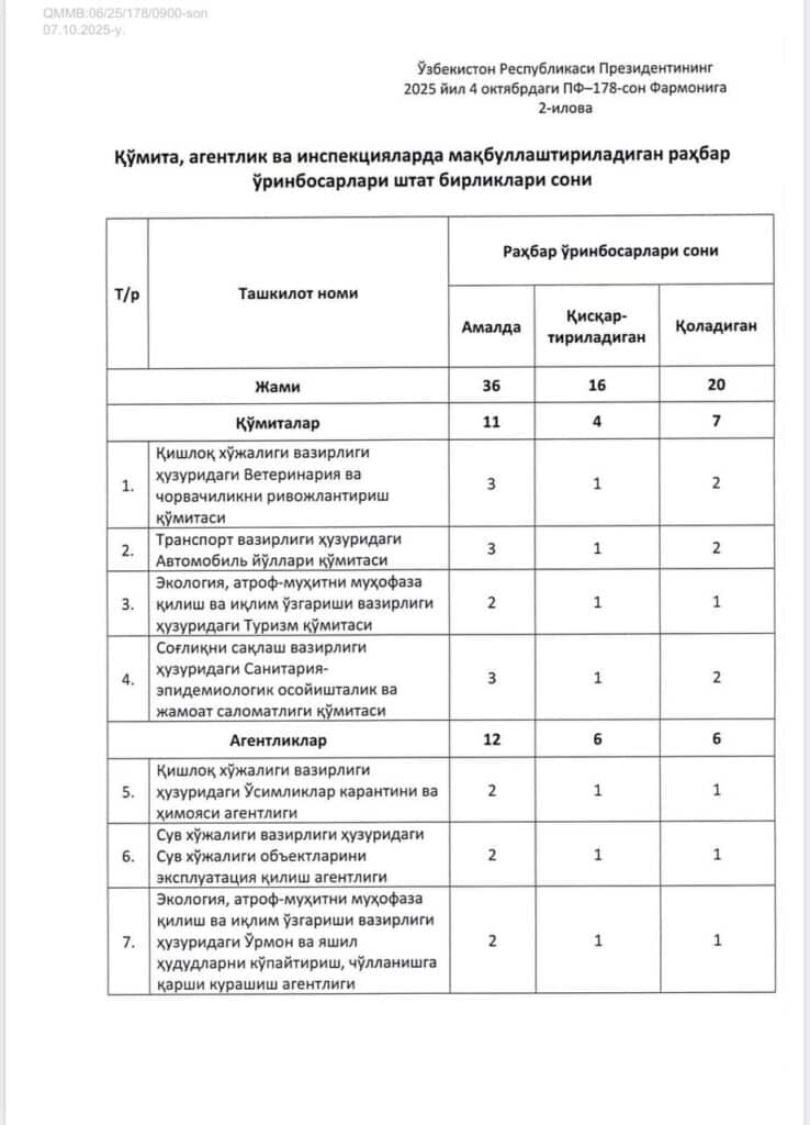 Bundan tashqari, turli qo‘mita, agentlik va inspeksiyalarda 16 nafar o‘rinbosar lavozimi ham tugatiladi.