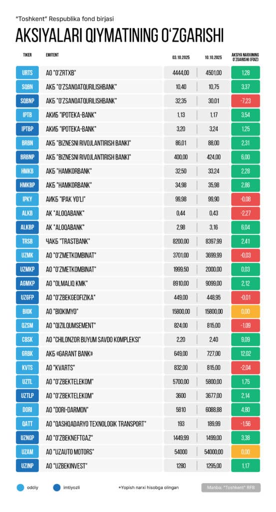 «Toshkent» respublika fond birjasi (RFB)da joy olgan yuqori likvidli aksiyalarning aksariyati 3-oktabrdan 10-oktabrgacha bo‘lgan davrda turli dinamikani ko‘rsatib, UCI fond indeksi 0,18 foizga pasaydi.
