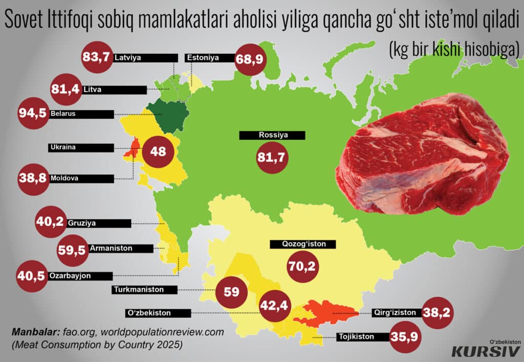 Jahon oziq-ovqat tashkiloti (FAO) ma’lumotlariga ko‘ra, o‘zbekistonliklar yiliga o‘rtacha 42,4 kg go‘sht iste’mol qiladi. Bu ko‘rsatkich dunyo bo‘yicha o‘rta darajaga yaqin.