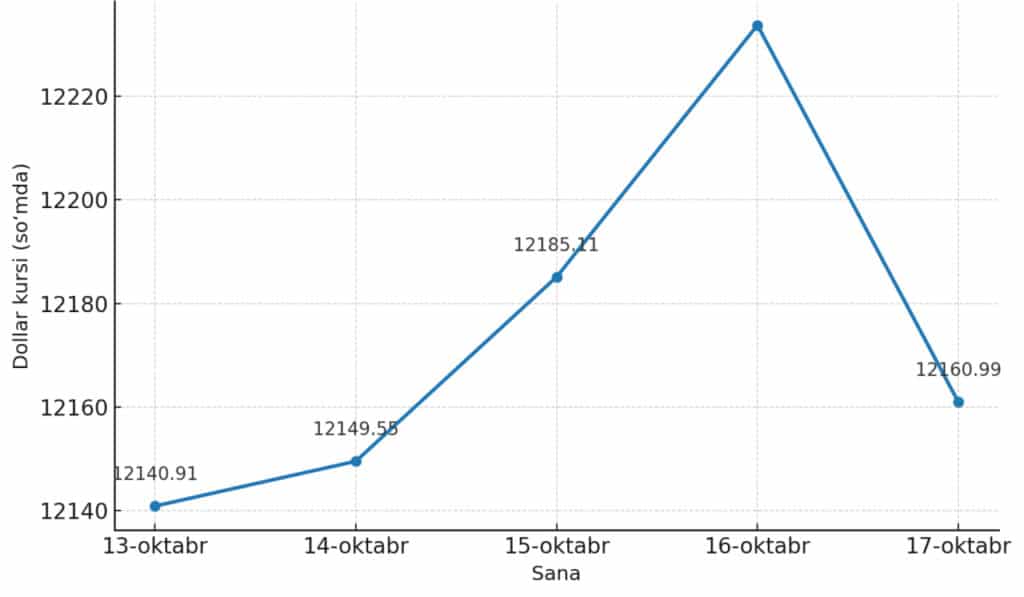 13-oktabr kuni dollar kursi 12 140,91 so‘mni tashkil etdi va avvalgi kunga nisbatan 17,53 so‘mga oshdi. 14-oktabrda valyuta biroz ko‘tarilib, 12 149,55 so‘m bo‘ldi. 15-oktabrda esa o‘sish sur’ati sezilarli bo‘lib, 12 185,11 so‘mga yetdi, bu esa 35,56 so‘mlik o‘sishni anglatdi.