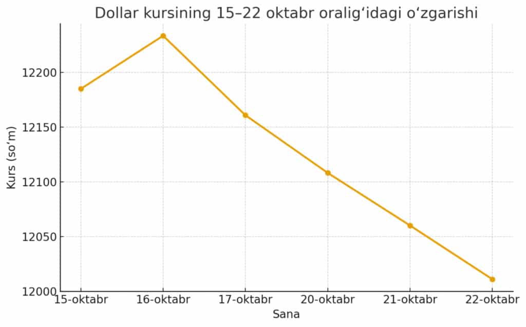 So‘nggi besh kun ichida dollar kursida pasayish ustun bo‘ldi. 15-oktabr kuni dollar 35,56 so‘m oshib 12 185,11 so‘mga teng bo‘ldi. 16-oktabr uchun 12 233,67 so‘m (+48,56 so‘m) etib belgilandi. 17-oktabr kuni AQSh valyutasi 12 160,99 so‘mga (-72,68 so‘m) tenglashdi. 20-oktabr kuni dollar 12 108,24 so‘m (-52,75 so‘m) etib belgilangan edi. 21-oktabr kuni dollar 2 060,15 so‘mga (-48,09 so‘m) tenglashgan edi.