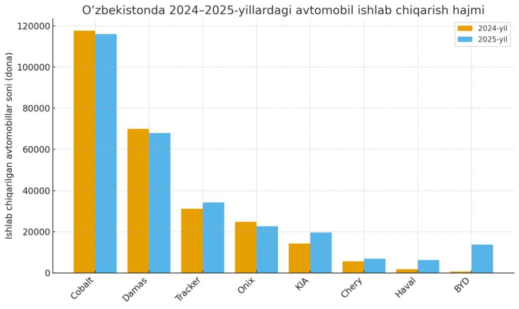 Statistika qo‘mitasi ma’lumotlariga ko‘ra, 2025-yil yanvar–sentabr oylarida Chevrolet Cobalt va Damas ishlab chiqarish hajmi o‘tgan yilning shu davriga nisbatan kamaygan.