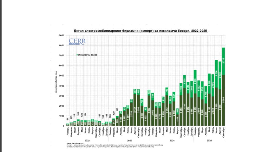 Sentabr oyida foydalanilgan avtomobillar segmentida 52,6 ming dona avtomobil sotilgan. O‘tgan oyda 7,8 ming dona elektromobil sotilgan – bu avgust oyiga nisbatan 21,6 foizga ko‘p va rekord natija hisoblanadi. Joriy yilning uchinchi choragida esa jami 20,7 ming dona elektromobil sotilgan bo‘lib, bu o‘tgan yilning shu davriga nisbatan 2,2 barobar ko‘pdir.