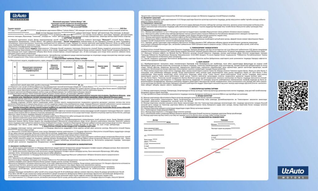 Rasmiy diler bergan shartnomadagi QR-kodni skanerlaganda undagi ma’lumotlar shartnomadagi ma’lumotlarga aynan mos bo‘lishi kerak. Faqat shunda u haqiqiy hisoblanadi.