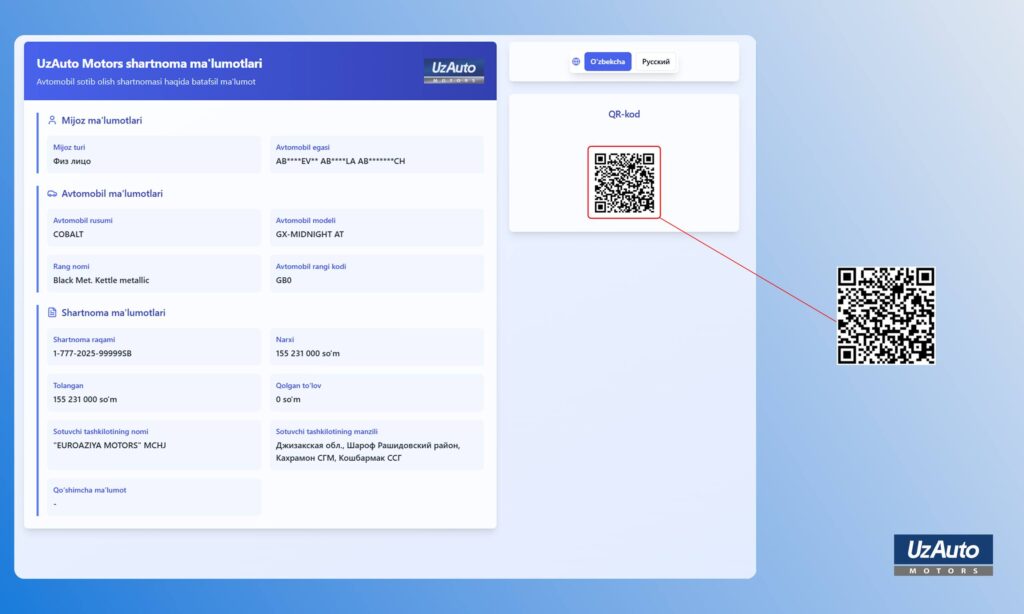 QR-kod orqali xaridor o‘z ism-sharifi, shartnoma raqami, avtomobil narxi, to‘lov tafsilotlari, diler nomi va manzili hamda shartnoma holatini onlayn tekshira oladi.