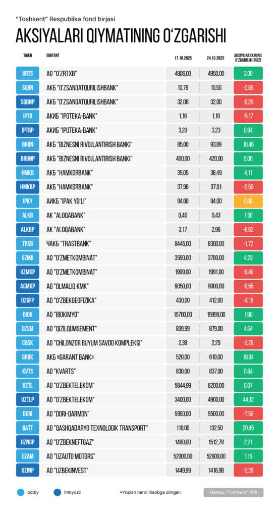 «Toshkent» respublika fond birjasidan (RFB) joy olgan yuqori likvidli aksiyalarning aksariyati 17-oktabrdan 24-oktabrgacha bo‘lgan davrda turli dinamikani ko‘rsatib, UCI fond indeksi 2,5 foizga oshdi.