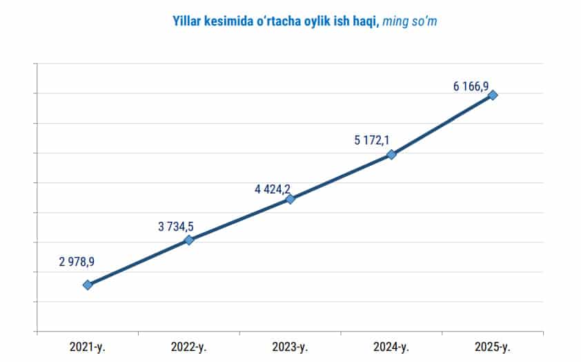 2025-yilning yanvar – sentabr oylarida O‘zbekistonda o‘rtacha oylik ish haqi 6,2 mln so‘mni tashkil etdi. Milliy statistika qo‘mitasi ma’lumotlariga ko‘ra, bu ko‘rsatkich o‘tgan yilning shu davriga nisbatan 19,2 foizga oshgan.