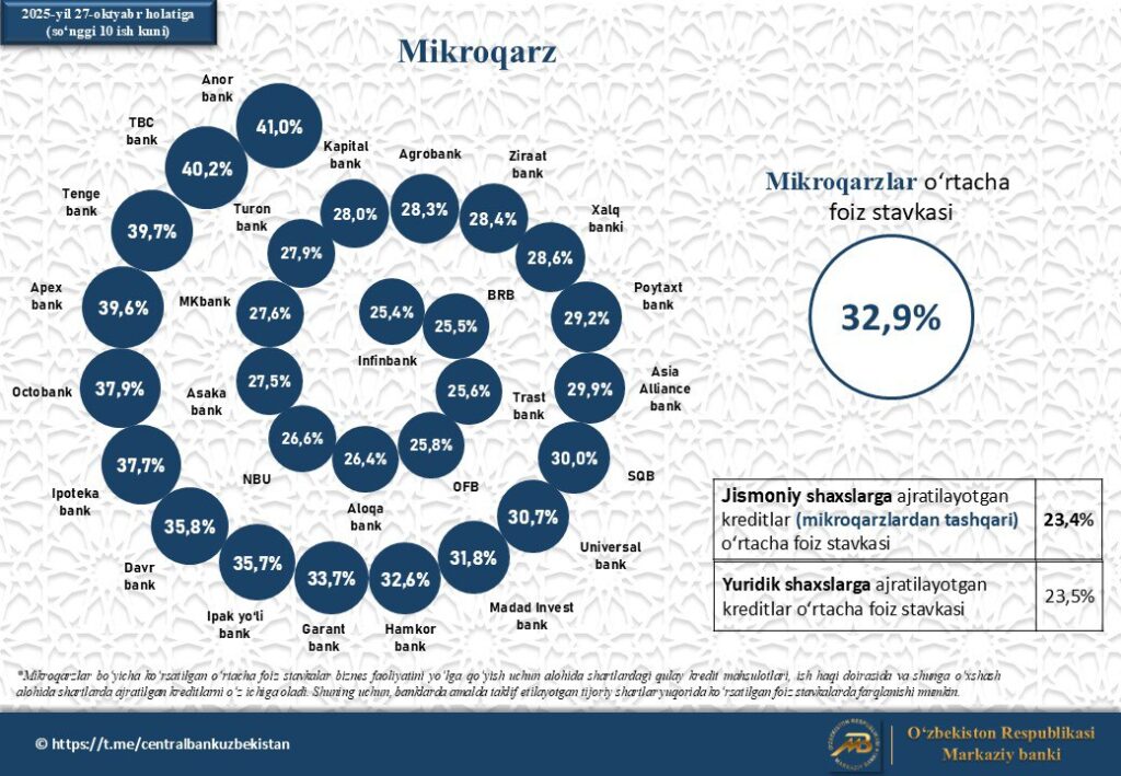 Mazkur davrda mamlakatdagi tijorat banklari tomonidan taqdim etilayotgan mikroqarzlar bo‘yicha o‘rtacha foiz stavkasi 32,9 foizni tashkil qilmoqda. Shundan jismoniy shaxslarga ajratilayotgan kreditlarning (mikroqarzlardan tashqari) o‘rtacha foiz stavkasi 23,4 foizni, yuridik shaxslar ulushi esa 23,5 foizni ko‘rsatmoqda.
