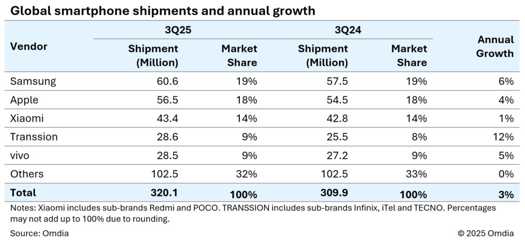 Umuman olganda, smartfonlar bozorining umumiy ulushi sezilarli o‘zgarishsiz qoldi. Uchinchi o‘rinni Xiaomi (14 foiz), to‘rtinchi o‘rinni Transsion (Tecno va Infinix brendlari bilan, 9 foiz), beshinchi o‘rinni esa Vivo (9 foiz) egalladi.