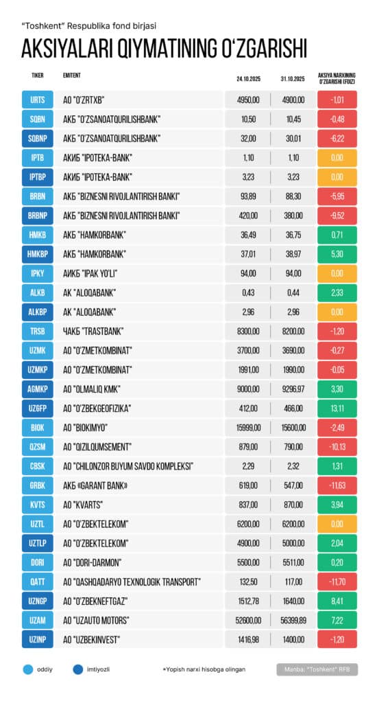 «Toshkent» respublika fond birjasidan (RFB) joy olgan yuqori likvidli aksiyalarning aksariyati 24-oktabrdan 31-oktabrgacha bo‘lgan davrda turli dinamikani ko‘rsatib, UCI fond indeksi 0,33 foizga oshdi.
