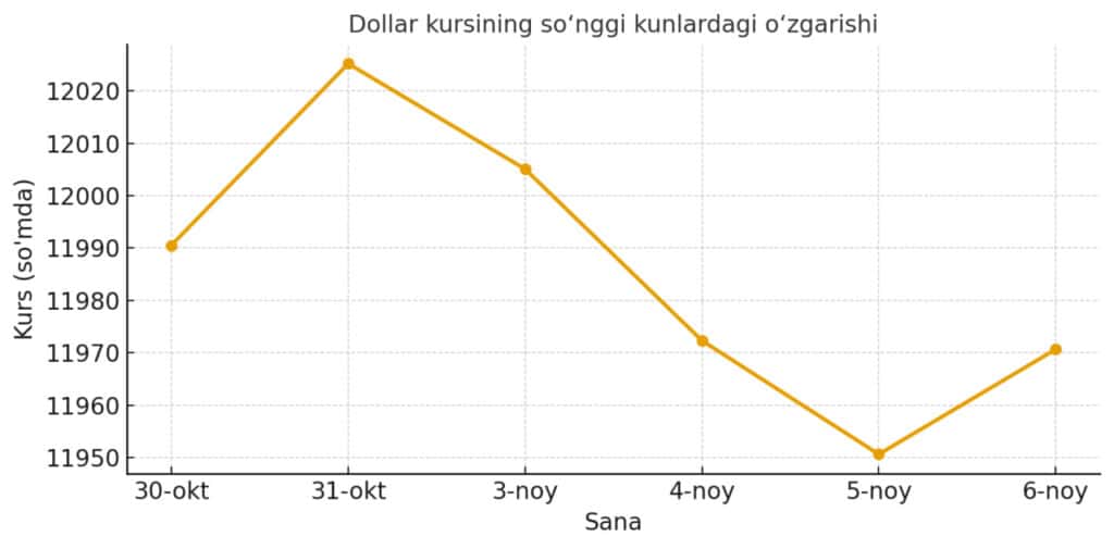 So‘nggi besh kun ichida dollar kursida pasayish ustun bo‘ldi. 30-oktabr kuni 11 990,53 so‘m (-13,94 so‘m)ga tenglashdi. 31-oktabr kuni AQSh valyutasi 12 025,22 so‘m (+34,69 so‘m) bo‘ldi. 3-noyabr kuni dollar 12 005,09 so‘mga (-20,13 so‘m) tenglashdi. 4-noyabr kuni dollar 11 972,34 so‘m (-32, 75 so‘m), 5-noyabr kuni esa 11 950,63 so‘m (-21,71 so‘m) etib belgilangan edi.