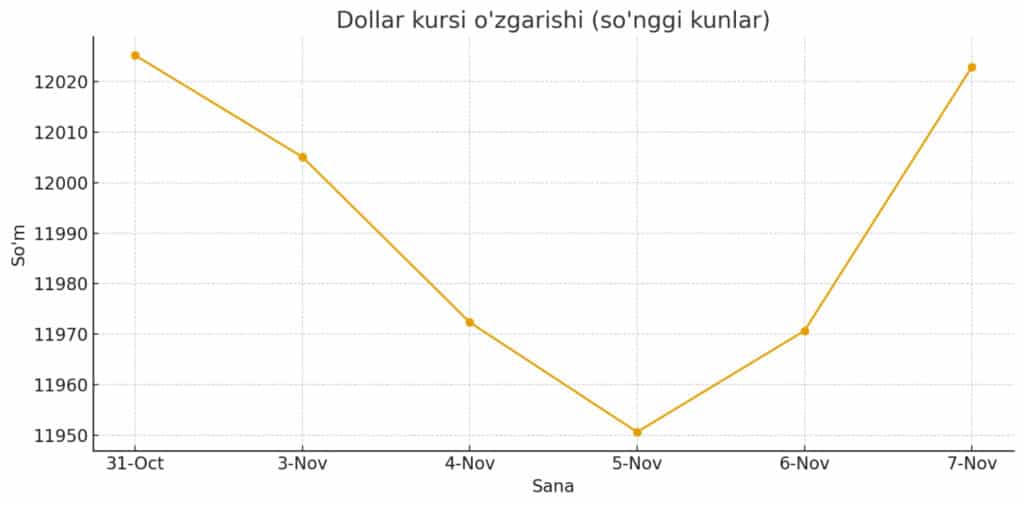 So‘nggi besh kun ichida dollar kursida pasayish ustun bo‘ldi. 31-oktabr kuni AQSh valyutasi 12 025,22 so‘m (+34,69 so‘m) bo‘ldi. 3-noyabr kuni dollar 12 005,09 so‘mga (-20,13 so‘m) tenglashdi. 4-noyabr kuni dollar 11 972,34 so‘m (-32, 75 so‘m), 5-noyabr kuni 11 950,63 so‘m (-21,71 so‘m), 6-noyabr kuni esa 11 970,67 so‘m (+20.04 so‘m) etib belgilangan edi.