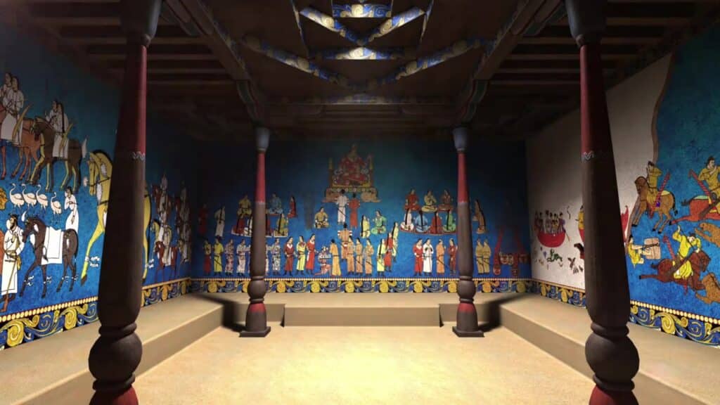 Ushbu devoriy suratlarda elchilar va kohinlar tasvirlangan. Ba’zilarning yuzlari oq ro‘mol bilan o‘ralgan, bu esa zardushtiylik marosimlarida dindorlar muqaddas olovni bulg‘amaslik uchun og‘izlarini yopishganini bildiradi. Hozirda bu devoriy suratlar Afrosiyob qo‘rg‘onidagi muzeyda saqlanmoqda.